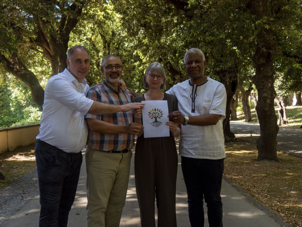 De afsluitende ceremonie van het internationale symposium ‘Rediscover and Build Hope for All‘ vond plaats in de Tuinen van de Paus. Daar ondertekenden de oprichtende partners Aartsbisschop Thabo Makgoba (Anglicaanse Kerk van Zuidelijk Afrika), University Of The Free State (Zuid-Afrika) en de Vrije Universiteit de Declaration of Interdependence.